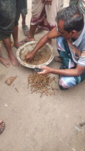বর্গাচাষী জইদুল ইসলাম জানান, তিনি জমিটি বন্ধক নিয়ে চাষাবাদ করে আসছেন। সকালে বাঁশের খুঁটি বসানোর সময় মাটির নিচে কাঠের বাক্সে থাকা গুলিগুলো দেখতে পান।