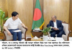 পরিবেশ, বন ও জলবায়ু পরিবর্তন মন্ত্রণালয়ের মন্ত্রী আবদুল আউয়াল মিন্টু-এর সাথে আজ বাংলাদেশ সচিবালয়ে তাঁর দপ্তরে বাংলাদেশে এশিয়ান ডেভেলপমেন্ট ব্যাংকের (এডিবি) কান্ট্রি ডিরেক্টর Hoe Yun Jeong এর মধ্যে এক সাক্ষাৎ অনুষ্ঠিত হয়েছে। এই সাক্ষাতে বাংলাদেশ ক্লাইমেট ডেভেলপমেন্ট পার্টনারশিপের (বিসিডিপি) আদর্শ কাঠামো নির্ধারণ এবং এর মাধ্যমে জলবায়ু অর্থায়নের সম্ভাব্য কৌশল ও পদ্ধতি নির্ধারণের বিষয়ে বিস্তারিত আলোচনা হয়।