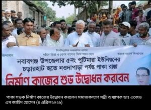 সমাজকল্যাণ এবং মহিলা ও শিশু বিষয়ক মন্ত্রী অধ্যাপক ডাঃ এজেডএম জাহিদ হোসেন আজ দিনাজপুর জেলার নবাবগঞ্জ উপজেলার পুটিমারা ইউনিয়নের চড়ারহাট থেকে নওদাপাড়া পর্যন্ত পাকা সড়ক নির্মাণ কাজের শুভ উদ্বোধন করেন।