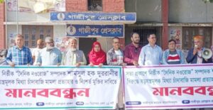 দৈনিক নওরোজ পত্রিকার সম্পাদক ও প্রকাশক শামসুল হক দুররানী’র বিরুদ্ধে মিথ্যা মামলা প্রত্যাহার ও তার নিঃশর্ত মুক্তির দাবিতে গাজীপুর প্রেসক্লাবের সামনে ১০ ডিসেম্বর বুধবার বেলা ১১ ঘটিকায় মানববন্ধন অনুষ্ঠিত হয়েছে। মানববন্ধনে দৈনিক নওরোজ পাঠক ফোরাম গাজীপুর এর সভাপতি মোঃ আক্তারুজ্জামানের সভাপতিত্তে ও সাংবাদিক মোঃ বায়েজীদ হোসেন এর সঞ্চালনায় প্রধান অতিথি হিসেবে উপস্থিত হয়ে বক্তব্য রাখেন গাজীপুর সাংবাদিক উইনিয়ন এর সভাপতি মোঃ দেলোয়ার হোসেন, এটিএন বাংলা ও এটিএন নিউজ এর স্টাফ রিপোর্টার, (গাজীপুর) মোঃ মাজহারুল ইসলাম মাসুম, দৈনিক মুক্ত বলাকা’র সম্পাদক ও প্রকাশক মোঃ আলমগীর হোসেন, একাত্তর টিভি’র স্টাফ রিপোর্টার (গাজীপুর) ইকবাল আহমেদ সরকার, দৈনিক ইত্তেফাক’র গাজীপুর জেলা প্রতিনিধি মোঃ মুজিবুর রহমান, দৈনিক কালের কন্ঠ’র স্টাফ রিপোর্টার (গাজীপুর) শরীফ আহমেদ শামীম, দৈনিক যুগান্তর’র গাজীপুর প্রতিনিধি শাহ্ সামসুল হক রিপন, দৈনিক প্রতিদিনের সংবাদ’র গাজীপুর জেলা প্রতিনিধি হাসমত আলী, দৈনিক সময়ের আলো’র গাজীপুর প্রতিনিধি মোঃ মিলটন খন্দকার,দৈনিক সকালের সময় গাজীপুর প্রতিনিধি মোঃ আবিদ হোসেন বুলবুল, এসময় উপস্থিত ছিলেন বাংলাদেশ বুলেটিন’র গাজীপুর জেলা প্রতিনিধি মোঃ শফিকুল ইসলাম জিতু, দৈনিক শুভদিন গাজীপুর প্রতিনিধি মোঃ নূরুল ইসলাম সবুজ, দৈনিক নতুন সময়’র গাজীপুর প্রতিনিধি মোঃ মাসুদ রানা, মোহনা টিভি’র গাজীপুর প্রতিনিধি মোঃ আতিকুর রহমান আমিন, দৈনিক আজকের বাংলা’র গোলাম রসুল দিনার, দৈনিক সময়ের কাগজ’র গাজীপুর জেলা প্রতিনিধি মোঃ মনির হোসেন সরকার, বিজয় টিভি’র মোঃ তৌফিক ইসলাম, দৈনিক যায়যায়দিন’র গাজীপুর সদর প্রতিনিধি মোঃ আইয়ুব খান, দৈনিক বর্তমান’র টঙ্গী প্রতিনিধি মোঃ মোস্তাকিম খান, দৈনিক নওরোজ’র টঙ্গী প্রতিনিধি মোঃ জাহাঙ্গীর আকন্দ, দৈনিক রূপালী বাংলাদেশ’র গাজীপুর প্রতিনিধি মোঃ জহিরুল ইসলাম, আদর্শ বাণী’র বার্তা সম্পাদক মোঃ রেজাউল করিম মোল্লা, দৈনিক নতুন ভোর’র চীফ রিপোর্টার মোঃ ইলিয়াস আপন, দৈনিক নওরোজ’র গাজীপুর মহানগর প্রতিনিধি শাহিনা আক্তার, সাংবাদিক ডাক্তার আতিকুর রহমান আতিক, হেলেনা আক্তার প্রমুখ।