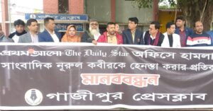 প্রথম আলো-ডেইলি স্টার অফিসে হামলা ও সাংবাদিক নূরুল কবীরকে হেনস্তা করার প্রতিবাদে মানববন্ধন করেছে গাজীপুর প্রেসক্লাব। ( ২১ ডিসেম্বর) রবিবার সকালে মহানগরীর রথখোলায় গাজীপুর প্রেসক্লাবের সামনে এ মানববন্ধন অনুষ্ঠিত হয়। এ সময় গণমাধ্যমের ওপর হামলা ও সাংবাদিকদের হেনস্তা করার তীব্র নিন্দা ও প্রতিবাদ জানিয়ে সাংবাদিক নেতৃবৃন্দ বলেন, শরীফ ওসমান হাদির কফিন সামনে রেখে দেশপ্রেমের পরিচয় দেয়া যেতো। কিন্তু কেউ কেউ তা না করে দেশে অরাজকতা সৃষ্টির চেষ্টা করেছেন। এতে শরীফ ওসমান হাদি হত্যার উদ্দেশ্য বুঝা গেছে। নির্বাচন বানচাল ও সরকারের ভাবমূর্তি নষ্ট করতেই এ ঘৃণ্য হামলা তা পরিস্কার হয়েছে। নেতৃবৃন্দ, হামলায় জড়িতদের চিহ্নিত করে দ্রুত গ্রেফতারের দাবি জানান।