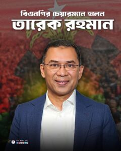 বিএনপির চেয়ারম্যান হিসেবে দায়িত্ব গ্রহণ করেছেন তারেক রহমান দলটির ভারপ্রাপ্ত চেয়ারম্যানের দায়িত্বে থাকা।